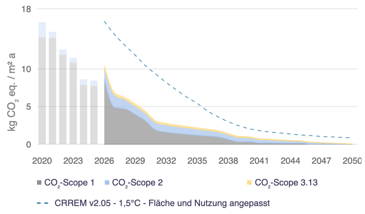 Risultato: 10,4 kg di equivalenti di CO2 all’anno e per m² di superficie di riferimento per il consumo energetico (Scope 1 + 2 + 3.13)